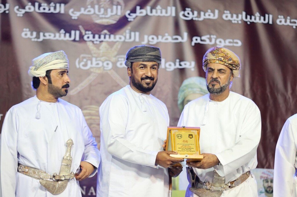 وفي ختام الأمسية، تفضّل راعي المناسبة سعادة السفير صالح بن محمد الصقري، بمعيّة رئيس فريق الشاطئ الرياضي المهندس خالد بن سعيد الزعابي ونائبه سليمان بن حمد الزعابي، بتكريم المشاركين وضيوف الشرف تقديرًا لعطائهم وإسهامهم الثقافي، وسط أجواء مفعمة بالامتنان والاعتزاز. كما بادرت إدارة فريق الشاطئ الرياضي بتكريم راعي الأمسية عرفانًا برعايته وتشريفه ودعمه للمشهد الثقافي.